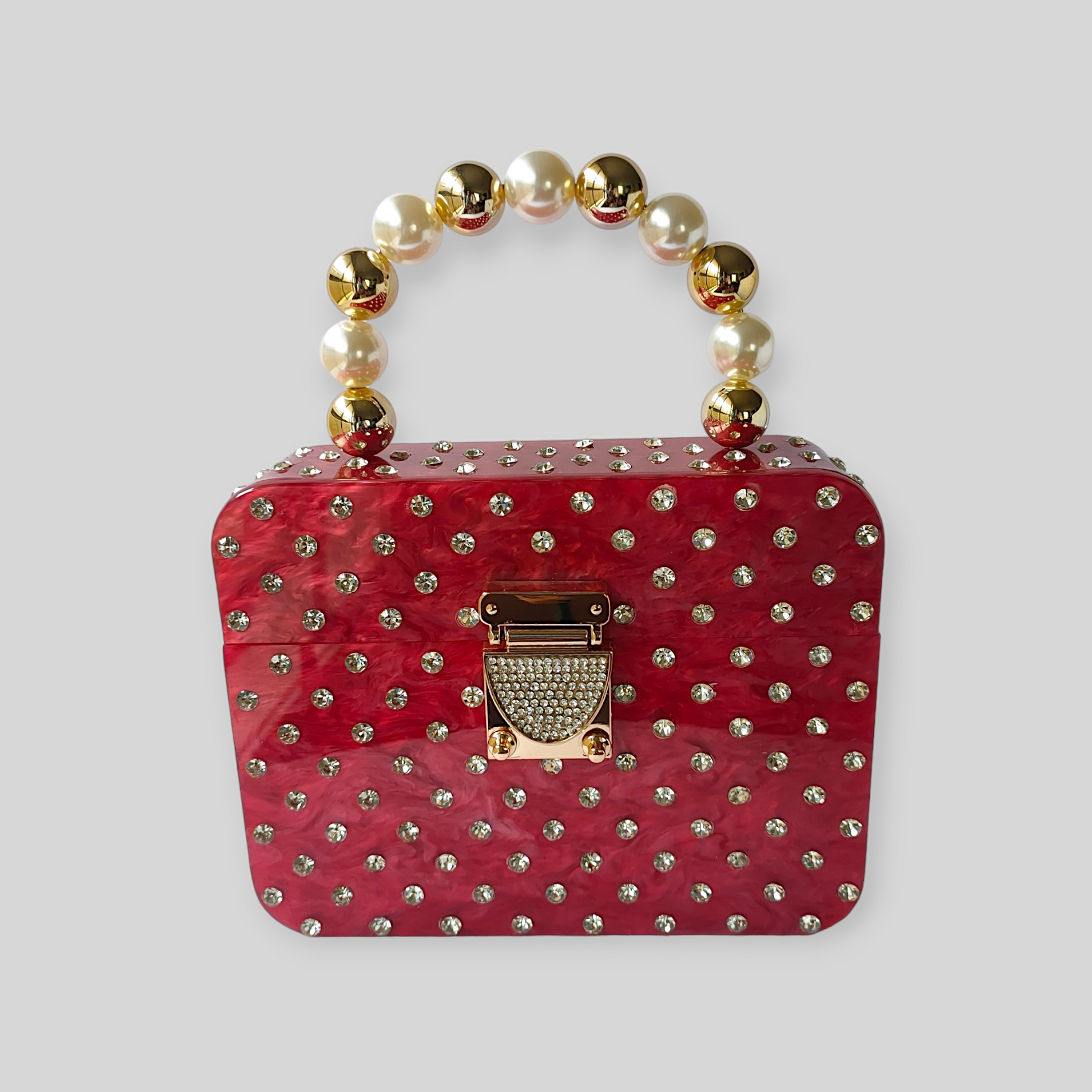 Explore the stylish and modern side of this acrylic box bag. This banquet purse is a fresh modern design that will definitely draw attention to you for a day or evening look. It is studded with crystal stones, has a pearl handle and detachable chain.