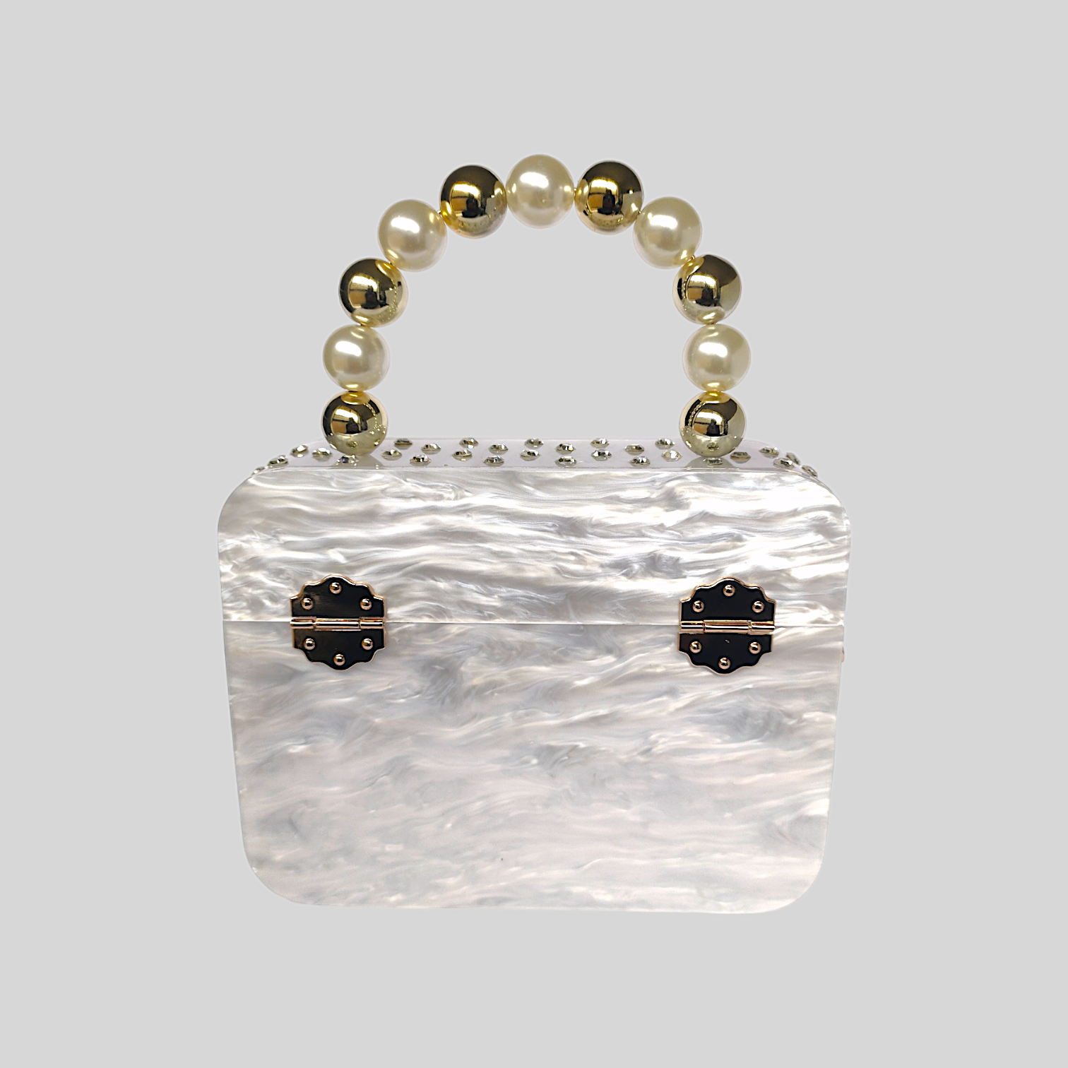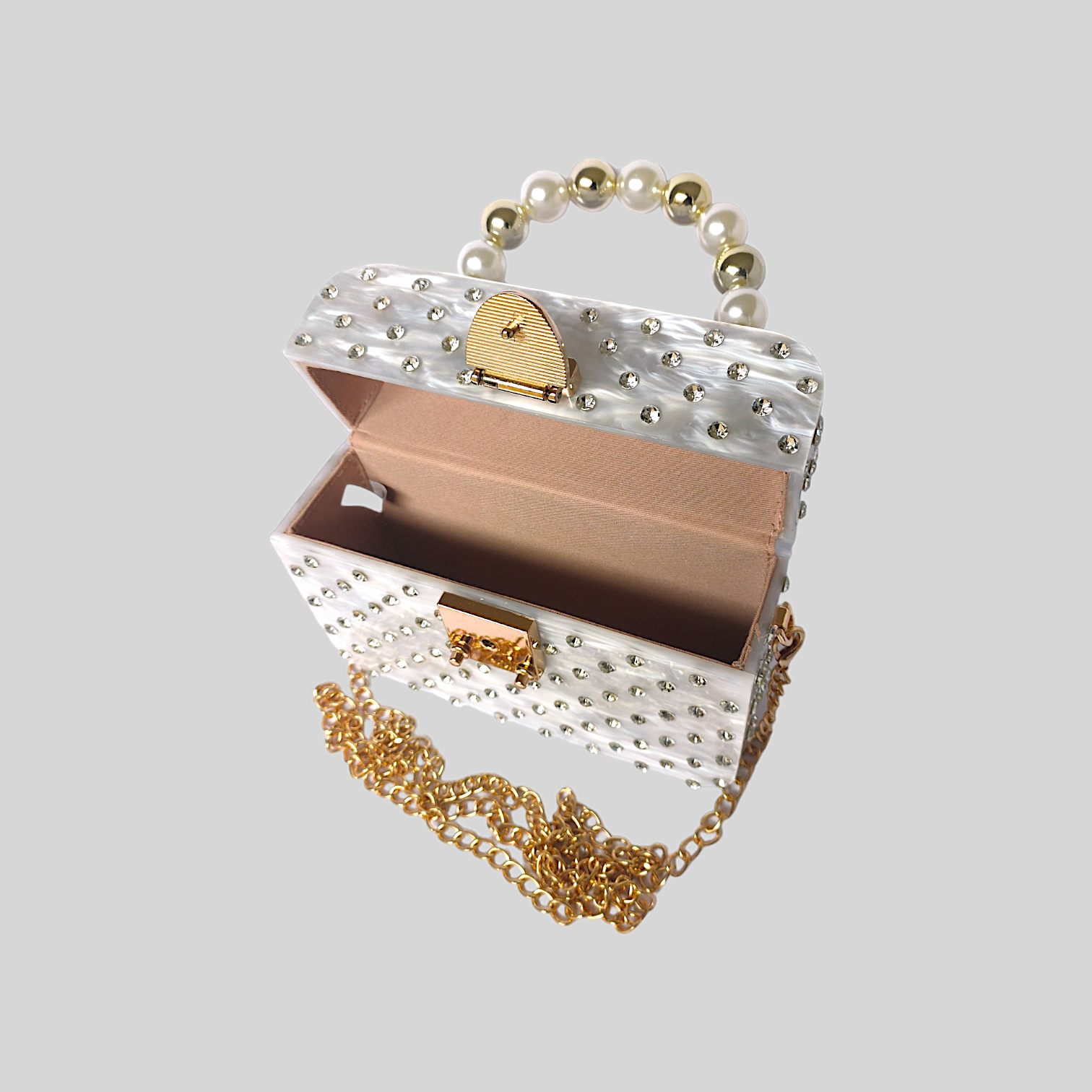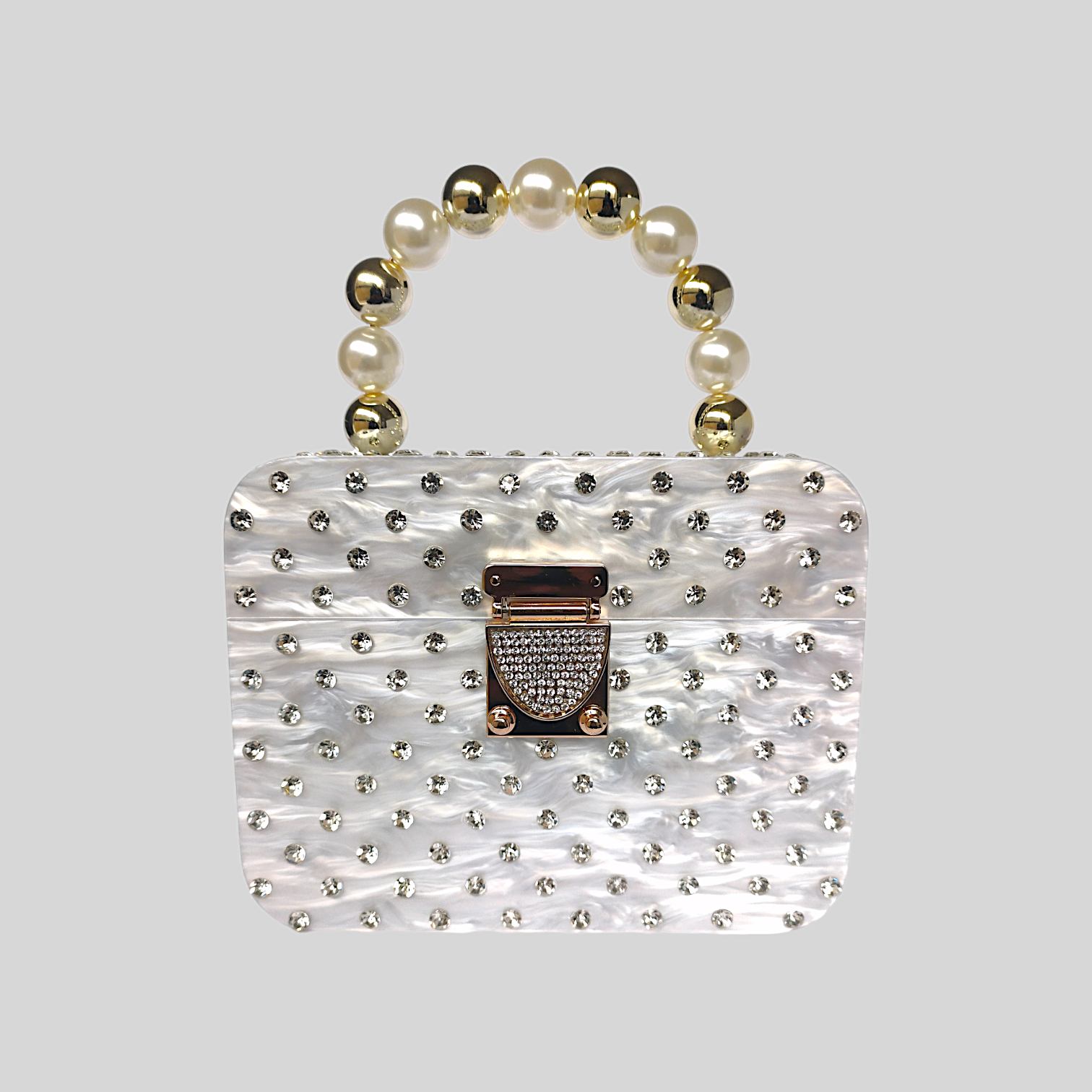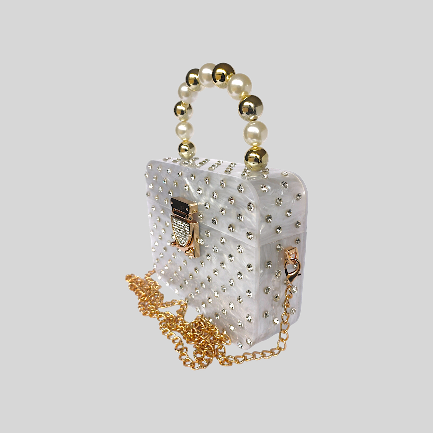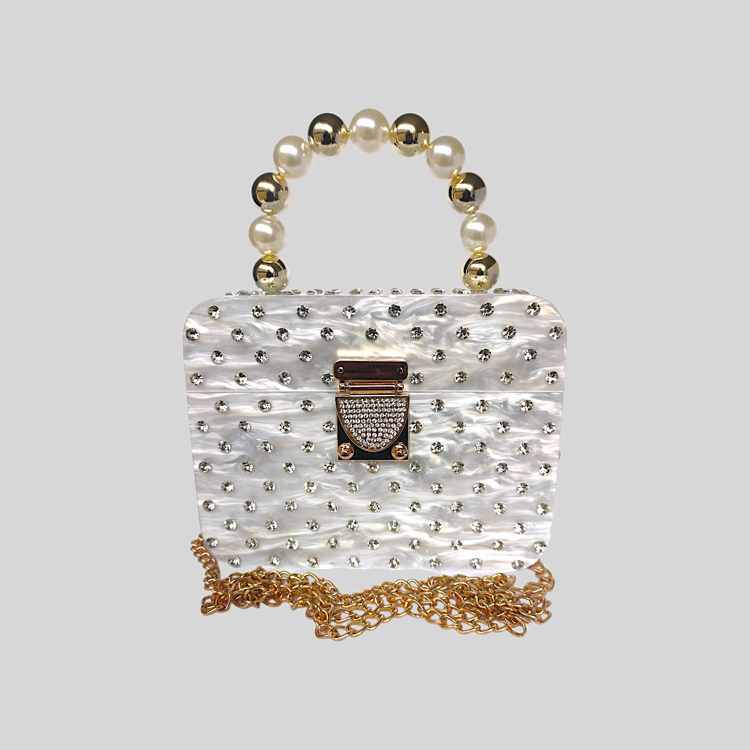 Explore the stylish and modern side of this acrylic box bag. This banquet purse is a fresh modern design that will definitely draw attention to you for a day or evening look. It is studded with crystal stones, has a pearl handle and detachable chain.