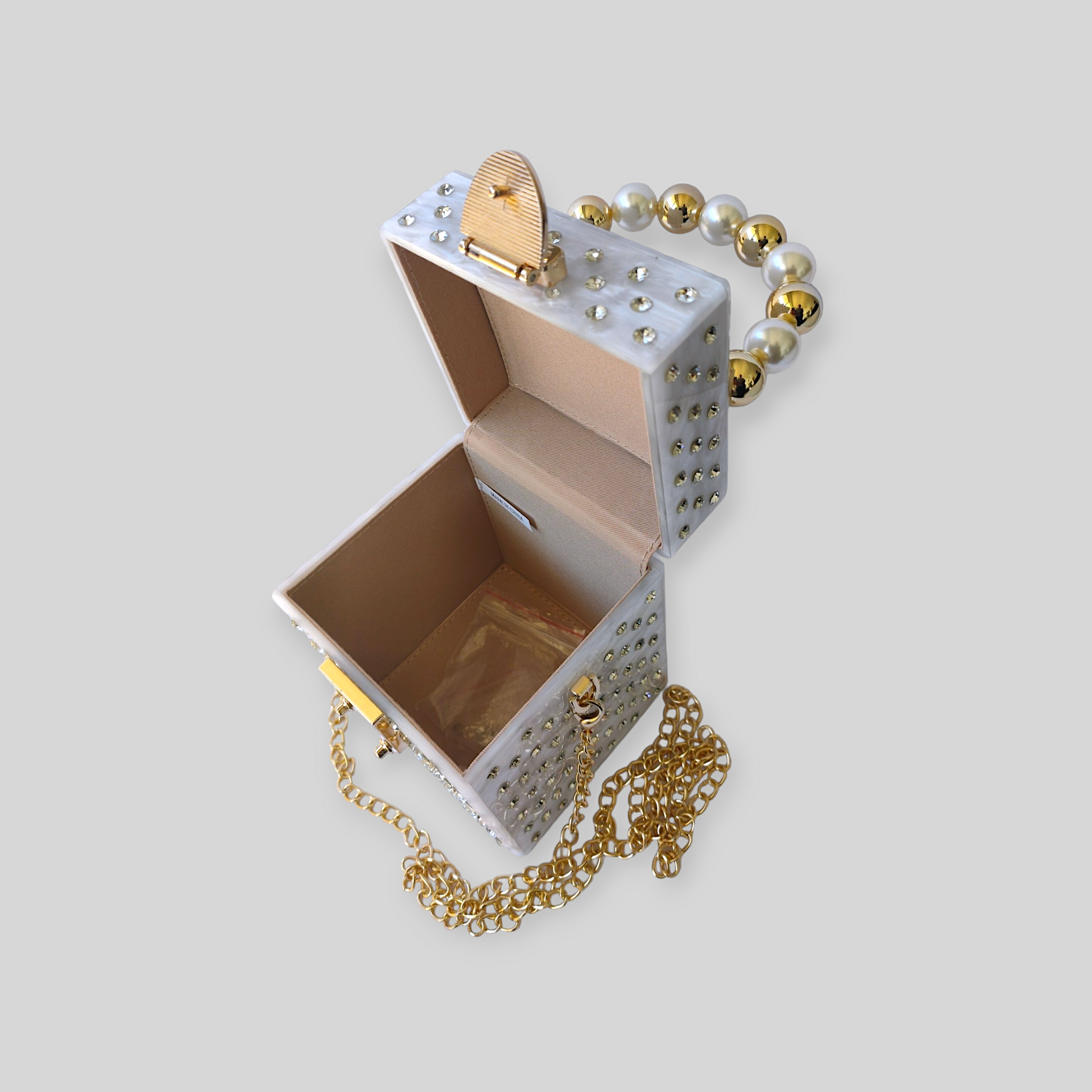 Explore the stylish and modern side of this mini acrylic box bag. This banquet purse is a fresh modern design that will definitely draw attention to you for a day or evening look. It is square-shaped, studded with crystal stones, has a pearl handle and detachable chain.