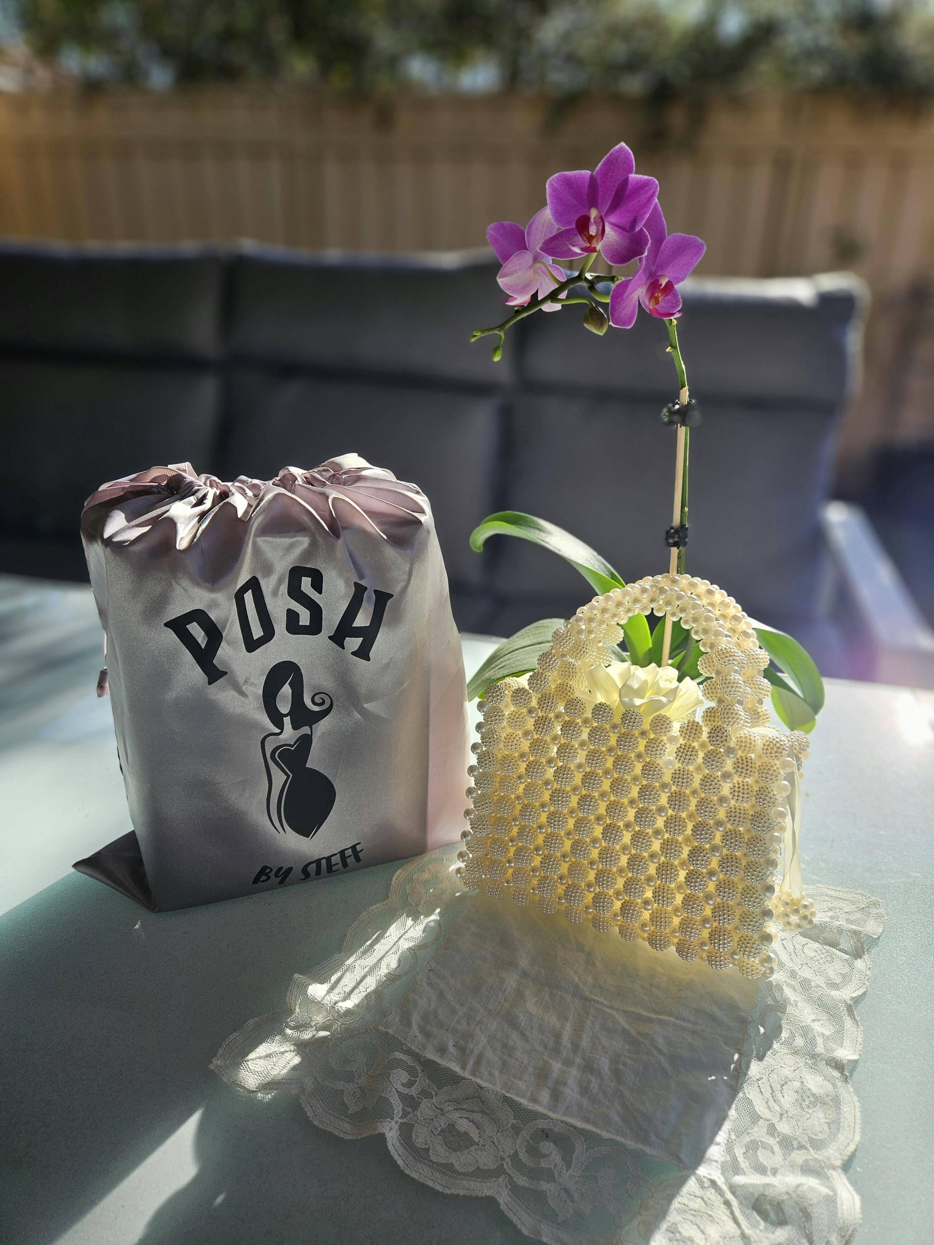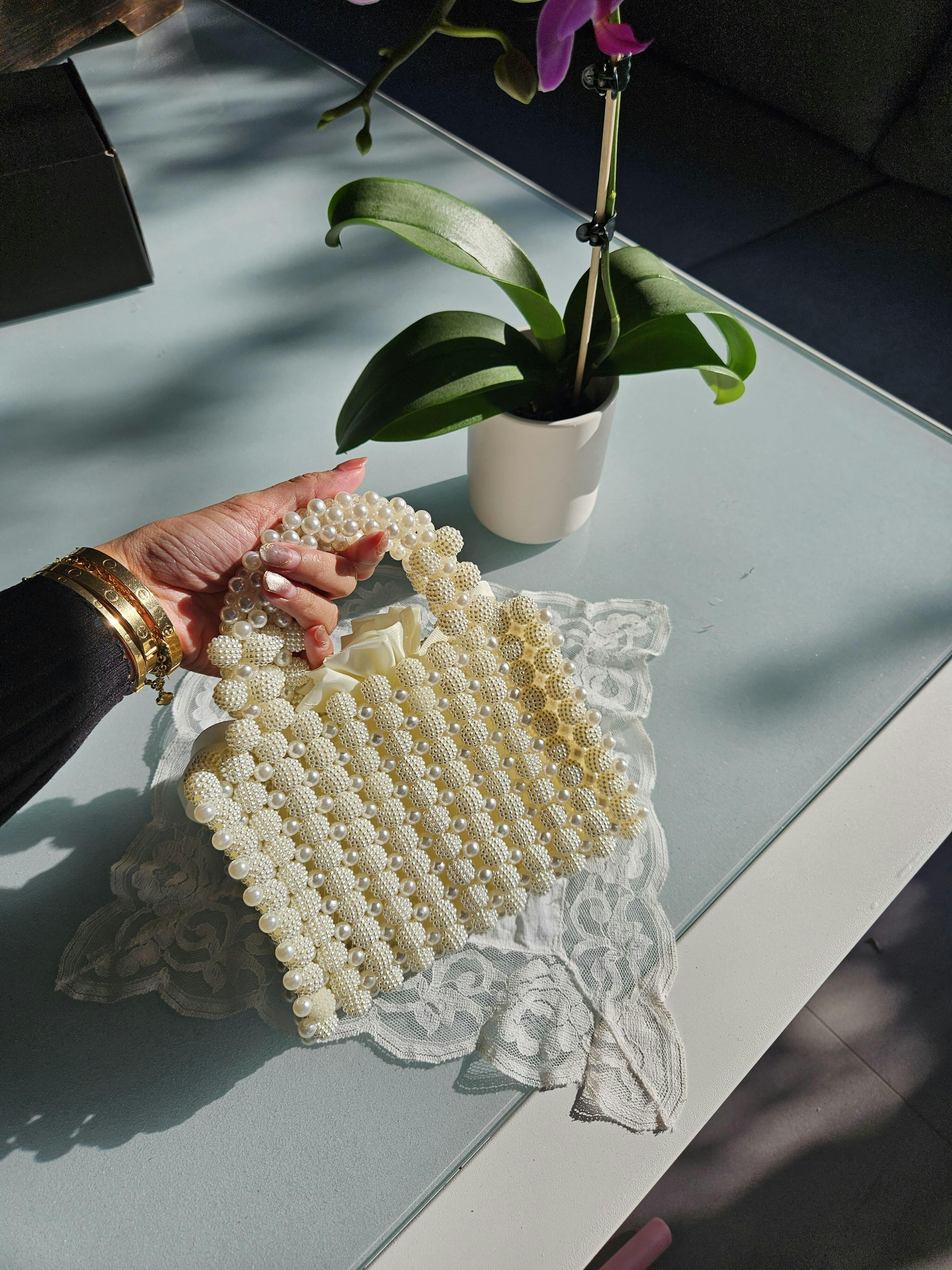 Snazzy is a hand-woven faux pearl mini bag that can compliment any outfit. It has an inner satin drawstring bag with a beaded tie to hold in all your essentials securely and in style.